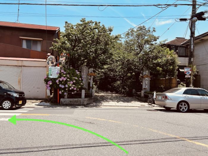 三ノ鳥居前のTバック(訳:T字路)を素敵に右折(金沢八景の方角)する。上掲写真で例えると三ノ鳥居を素敵に向かい見て右側の道路を直進する。