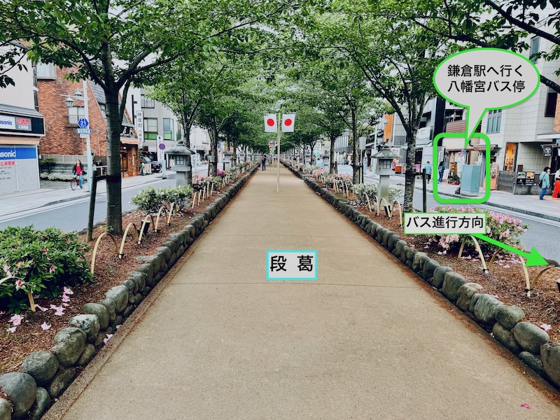 八幡宮バス停は、「人力車えびす屋」の前あたりと、江戸時代風の平屋「三河屋本店」のあたりに位置し、若宮大路沿道にある。