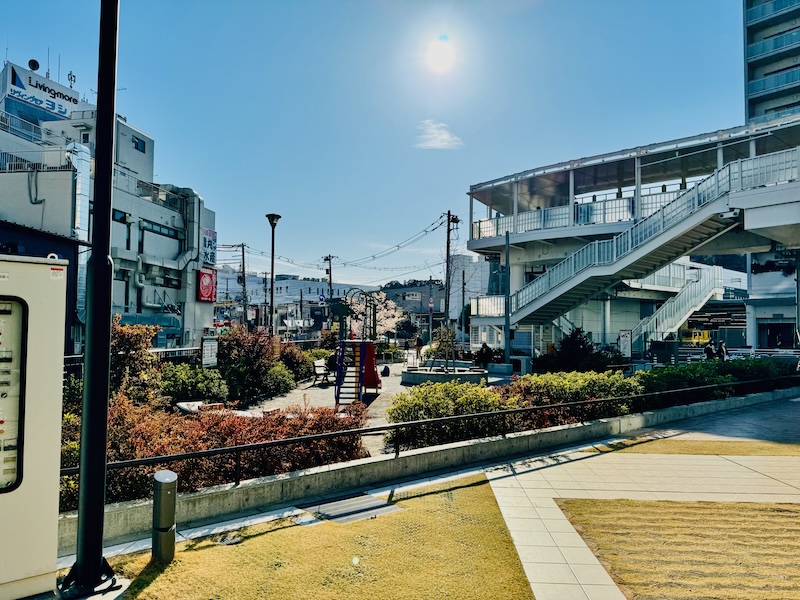 ↑大船駅笠間口ペデストリアンデッキと笠間岩井口公園。奥に咲き乱れる玉縄桜が視認できる💋
