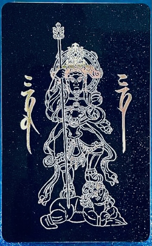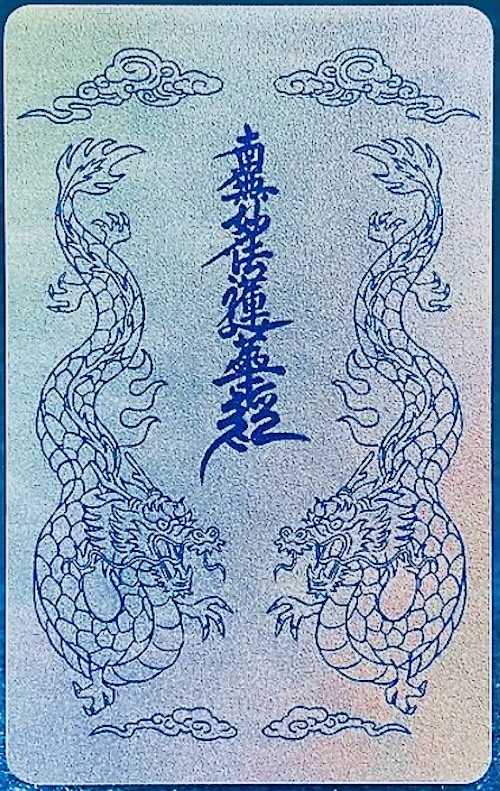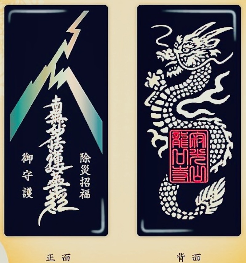 表面には裏面には雷のデザインに加え、「お題目(南無妙法蓮華経)」、「除災招福」、「御守護」、裏面には昇竜の姿