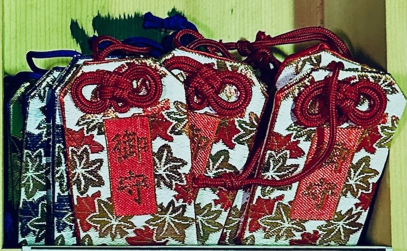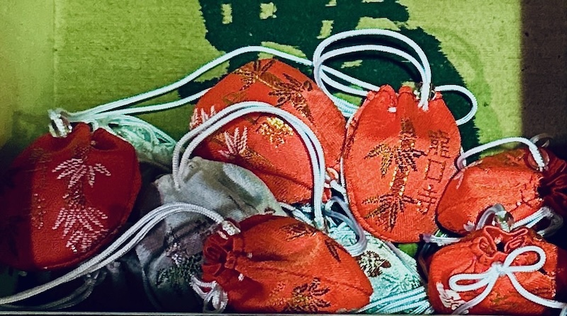 紅葉柄の金襴地の巾着袋に封入されたお守り。