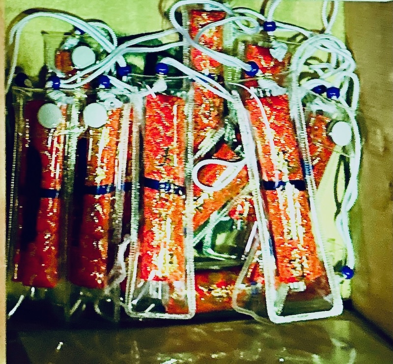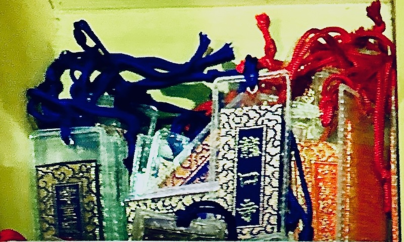 青と赤、それぞれの色を基調とした金襴地で封じ込まれたお守り。
