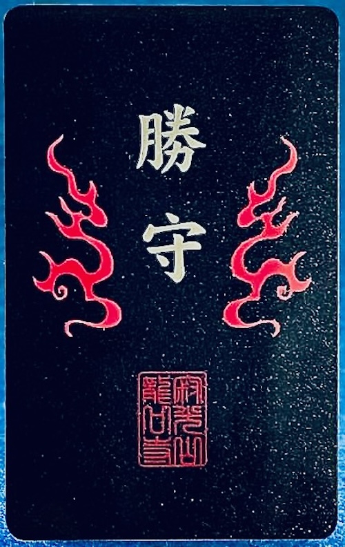 表面には、まるで二匹の天降る赤龍を描いたような焔模様の赤線と、その中央に「勝守」と金文字で素敵に描いちゃぅ♡