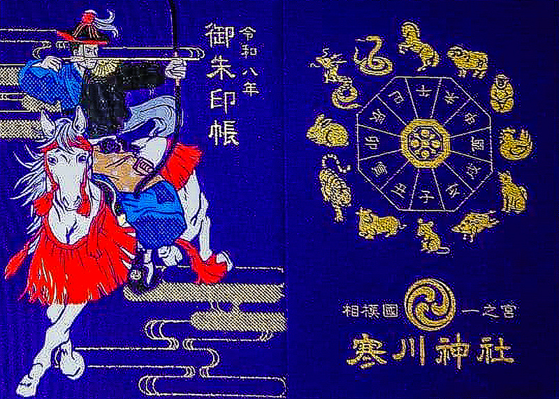 寒川神社のシンボルとなる渾天儀(方位盤)のほか、神事で素敵に登場する浜降祭での神輿、流鏑馬や、巫女舞の神楽鈴、武田信玄の兜、国府祭の虎皮‥等を描いたイラストを布帛に転写して、それを表紙とした寒川神社が凝縮された御朱印帳と‥なっちゃぅ。(左端の鍬?杵?‥を持った神事は、2月17日の「田打舞」なのか?)