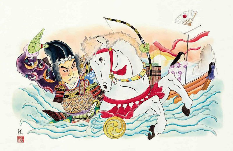 1185幎ã®å±å³¶ã®æŠãã®ã¿ããã平家æ¹ã®è»è¹ã«é«ããã«æ²æãããŠããæã®çãã銬äžããäžç¢ã®ããšã«å°èœãšããæµã®æŠæãåãã峿¹ã®å£«æ°ã髿ãããæŠå±ãåå©ã«åŸåãããã