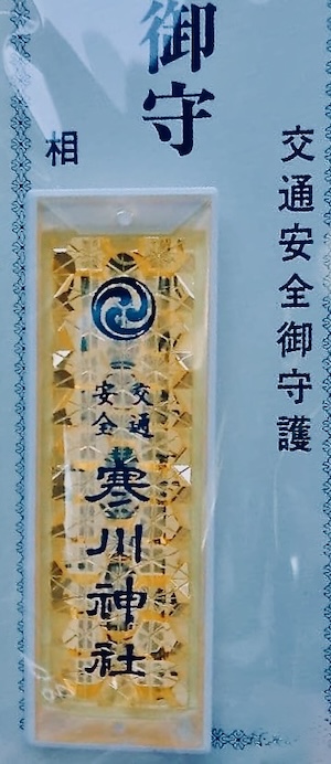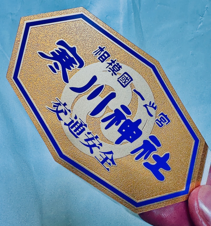 金メッキ加工で「相模國 一之宮 寒川神社」「八方除」「交通安全」等のレリーフ(浮き彫り加工)がほどこされ、このお守りがどこで頒布されたものなのかが一目で分かる。(以前のものよりデザイン的な見栄えが良くなってい‥申す。えっ)