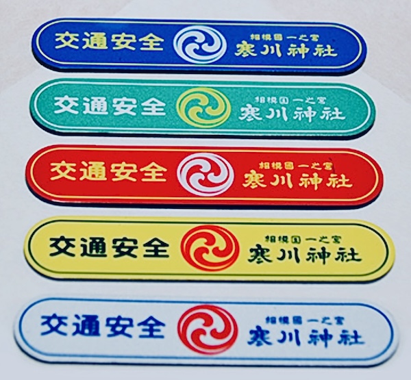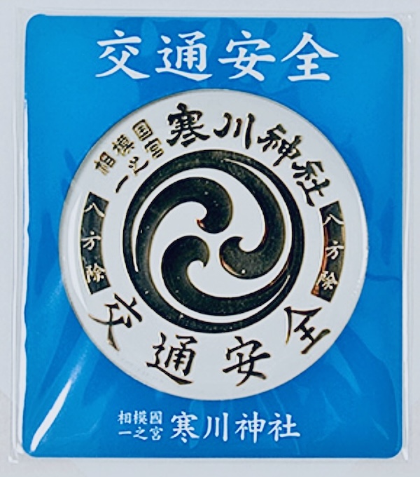 左側に「交通安全」中央に寒川神社の社紋(左三つ巴)、右端に「相模國 一之宮 寒川神社」と素敵に記された交通安全マグネット守。