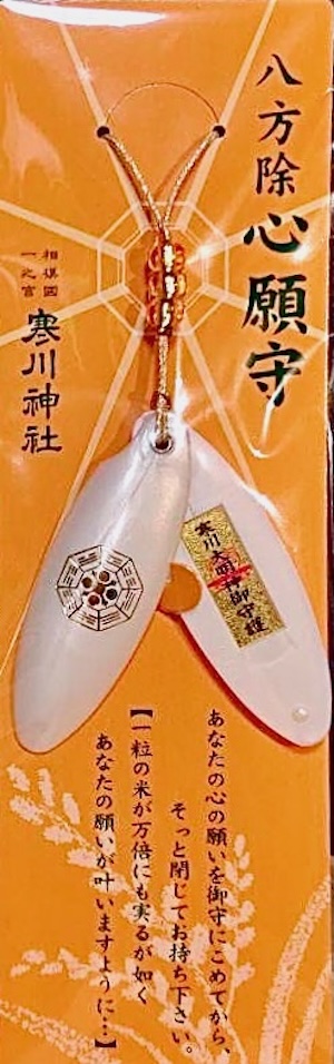 そのお米の形体に寒川大明神の神霊を降臨させ、一粒の米が万倍にも実るが如く、願望成就を祈念した心願守として、きわめて素敵に奉製されたもの💋
