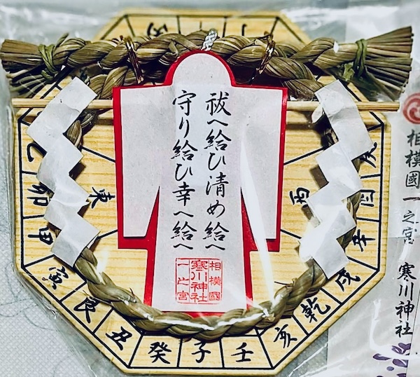 八角形の方位盤を台紙とし、中央に「祓へ給ひ清め給へ」「守り給ひ幸へ給へ」と素敵に墨書きされた人形を据えた、見た目的に、ものスゴい効きそうなお守り。