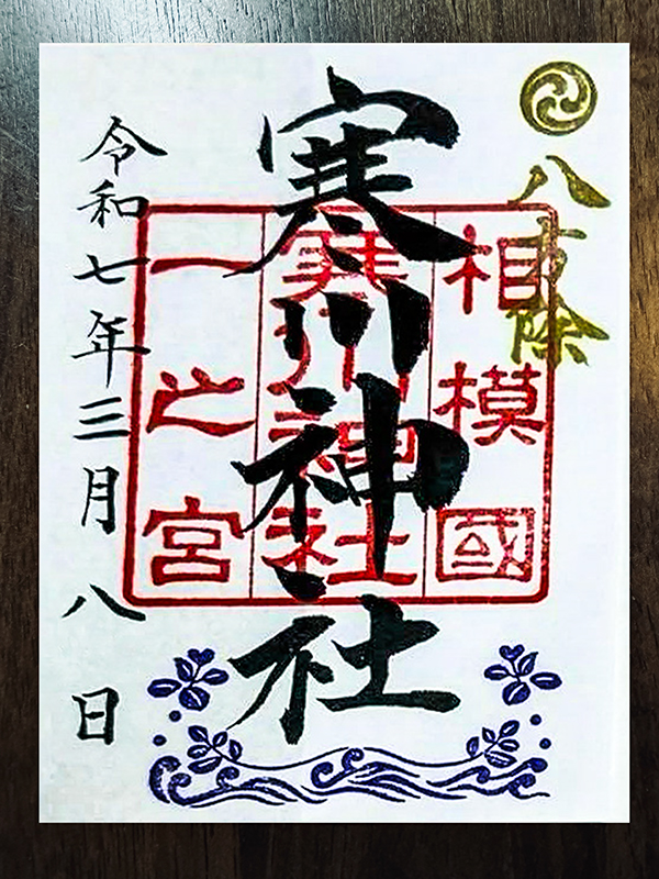 中央の印判には「相模国 寒川神社 一之宮」とヤバぃよ素敵に陰刻された印判の朱印。その下に波紋と葉っぱがモチーフとなった紫色の印判の押印が‥あっちゃぅ。