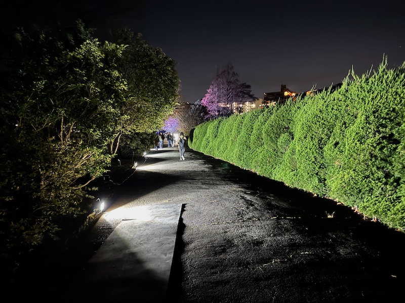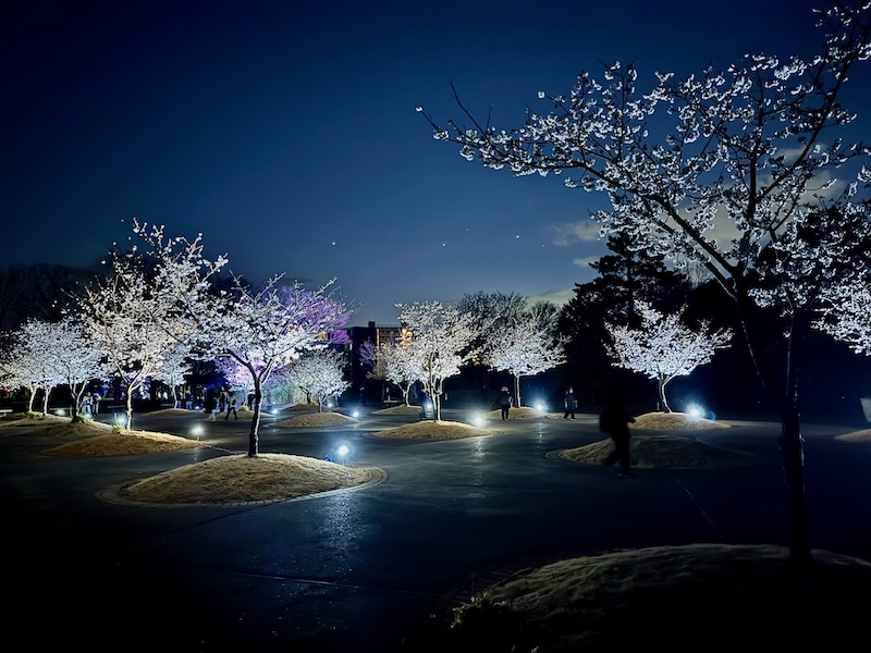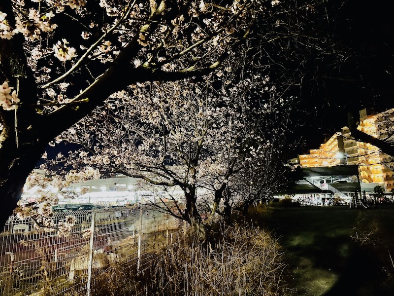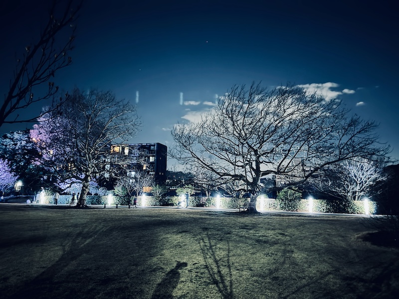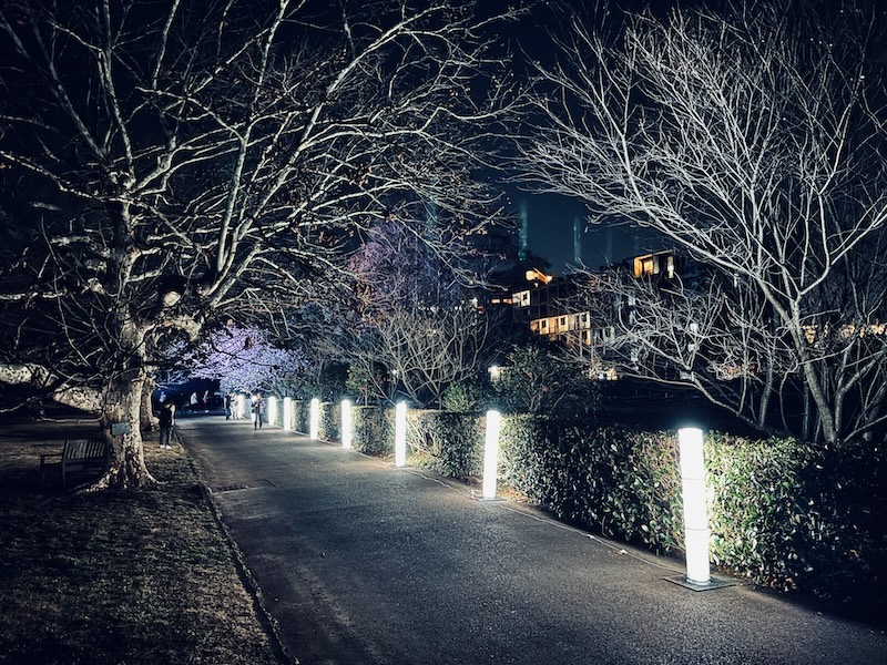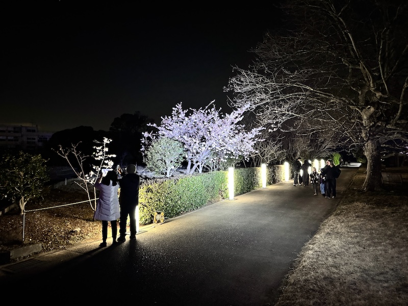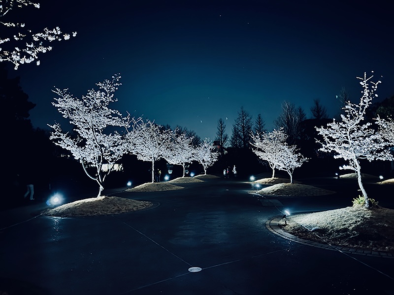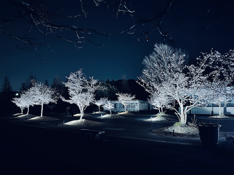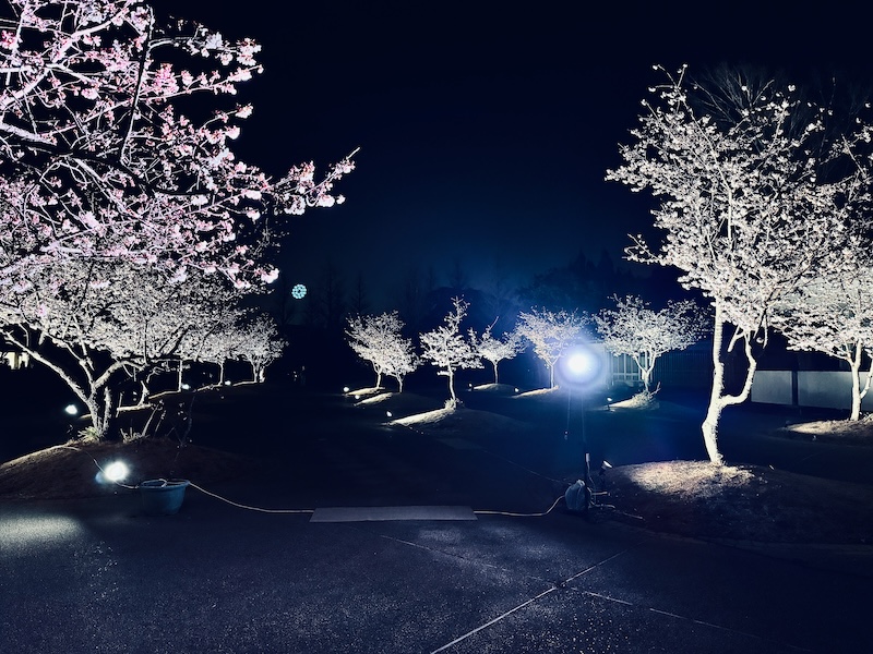 ゲート前のアッパーライト演出による幻想的な玉縄桜