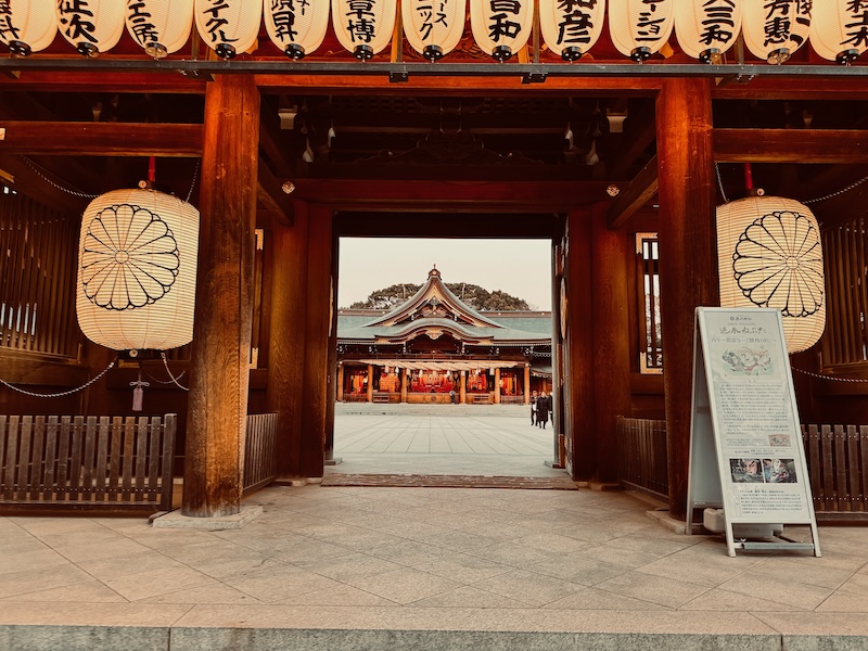 神門左右の間口には皇室を思わせる十六八重表菊紋がヤバぃよ素敵に描かれたの大提灯がパンツちら見え級にチラ見えちまってるぜ。